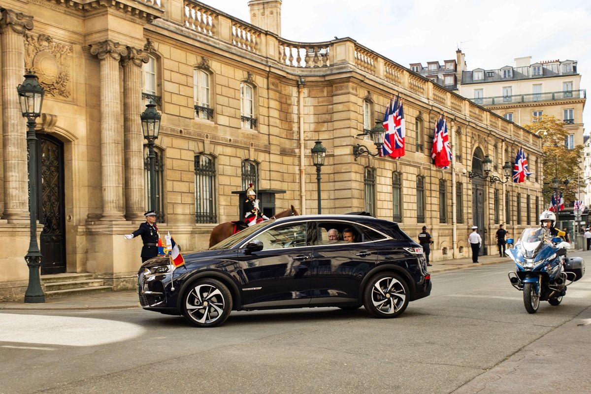 Οι δύο αρχηγοί κρατών παρέλασαν με το DS 7 CROSSBACK PRESIDENTIEL, η πρώτη εμφάνιση του οποίου χρονολογείται τον Μάιο του 2017. Το DS 7 CROSSBACK PRESIDENTIEL ήταν το πρώτο DS 7 που βγήκε στο δρόμο. Είχε ήδη επιδείξει όλη την τεχνογνωσία της DS Automobiles με μια ειδικά διαμορφωμένη ανοιχτή οροφή και στοιχεία που προσδιορίζουν τον σκοπό “Γαλλική Δημοκρατία”, υπογραφές, χειροποίητες επιχρυσωμένες ενθέσεις, βάση σημαίας κλπ). Το μαύρο Art Leather εσωτερικό αναδεικνύει το γαλλικό design: ο Lacquered Canvas σχεδιάστηκε και κατασκευάστηκε από το Atelier Maury. Πλήθος από DS 7 συνόδευσαν την πομπή, μεταξύ αυτών και το DS 7 ÉLYSÉE. Η βασίλισσα Καμίλλα και η Μπριζίτ Μακρόν επέβαιναν σε ένα από αυτά. Το DS 7 ÉLYSÉE, που εντάχθηκε στο στόλο της Προεδρίας της Γαλλικής Δημοκρατίας τον Νοέμβριο του 2021, είναι μια μοναδική έκδοση βασισμένη στο DS 7 E-TENSE 4×4 300 με επιμηκυμένο πλαίσιο και ειδικό επιπλέον εξοπλισμό. Το DS 7 ÉLYSÉE αποτελεί μέρος μιας μακράς σειράς μοντέλων DS που κατασκευάζονται για την Προεδρία της Δημοκρατίας.