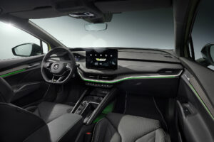 Στο εσωτερικό, η φιλοσοφία Design Selections στο ENYAQ COUPÉ RS iV εκφράζεται με δύο ειδικά σχεδιασμένες επιλογές, τη βασική “RS Lounge” και την προαιρετική “RS Suite”. Χαρακτηρίζονται από διακοσμητικές λωρίδες με εφέ από ανθρακονήματα στο ταμπλό και την επένδυση των θυρών, καλύμματα πεντάλ σε σχέδιο αλουμινίου και σπορ καθίσματα με ενσωματωμένα προσκέφαλα και έμβλημα RS, ενώ και το θερμαινόμενο πολυλειτουργικό δερμάτινο σπορ τιμόνι με τρεις ακτίνες διαθέτει σήμα RS. Ανάλογα με την επιλογή τα καθίσματα είναι επενδεδυμένα με μαύρες μικροΐνες Suedia ή μαύρο διάτρητο δέρμα.